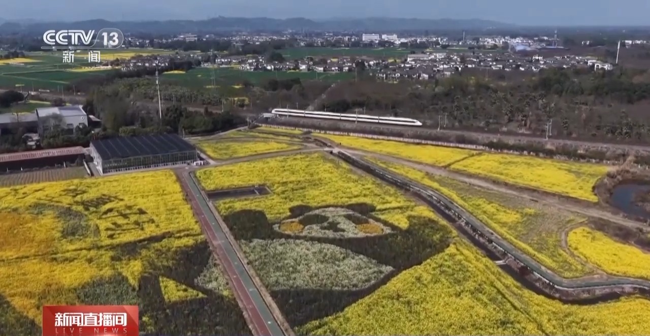 总台记者 刘玥辰:看,那就是成都雅安往返的列车,每天会有很多班次穿越这片油菜花海。如果天气足够好的话,你还可以看到油菜花、列车和雪山同框的画面。